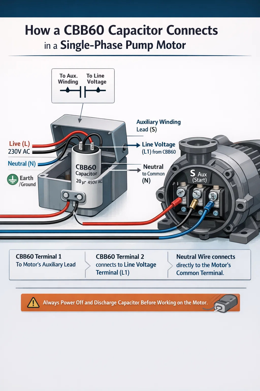Эта процедура охватывает наиболее распространенную установку CBB60: однофазный водяной насос или двигатель насоса для бассейна, либо с внешним корпусом конденсатора, либо с конденсатором непосредственно внутри клеммной коробки двигателя. Та же логика применима к воздушным компрессорам, стиральным машинам и двигателям вентиляторов систем отопления, вентиляции и кондиционирования воздуха.
