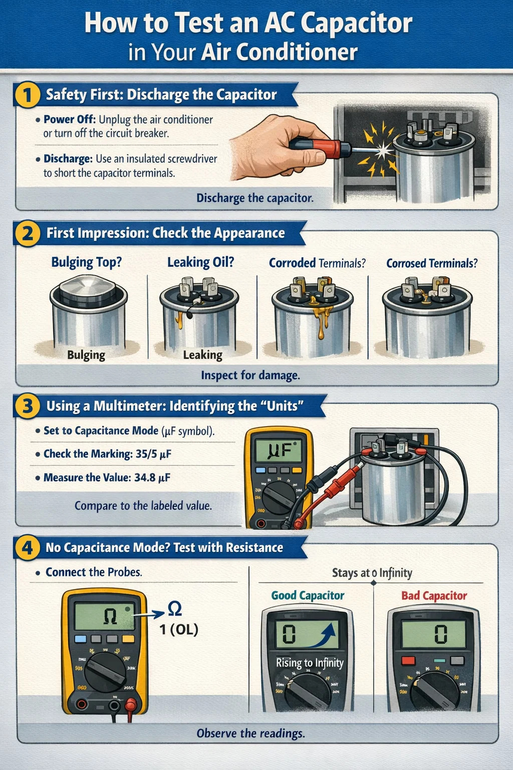 Чтобы определить, хороший или плохой конденсатор переменного тока в кондиционере, не требуется профессиональных знаний в области электроники. Если у вас есть мультиметр с функцией «проверки емкости», вы можете выполнить следующие действия и самостоятельно стать полуэкспертом.