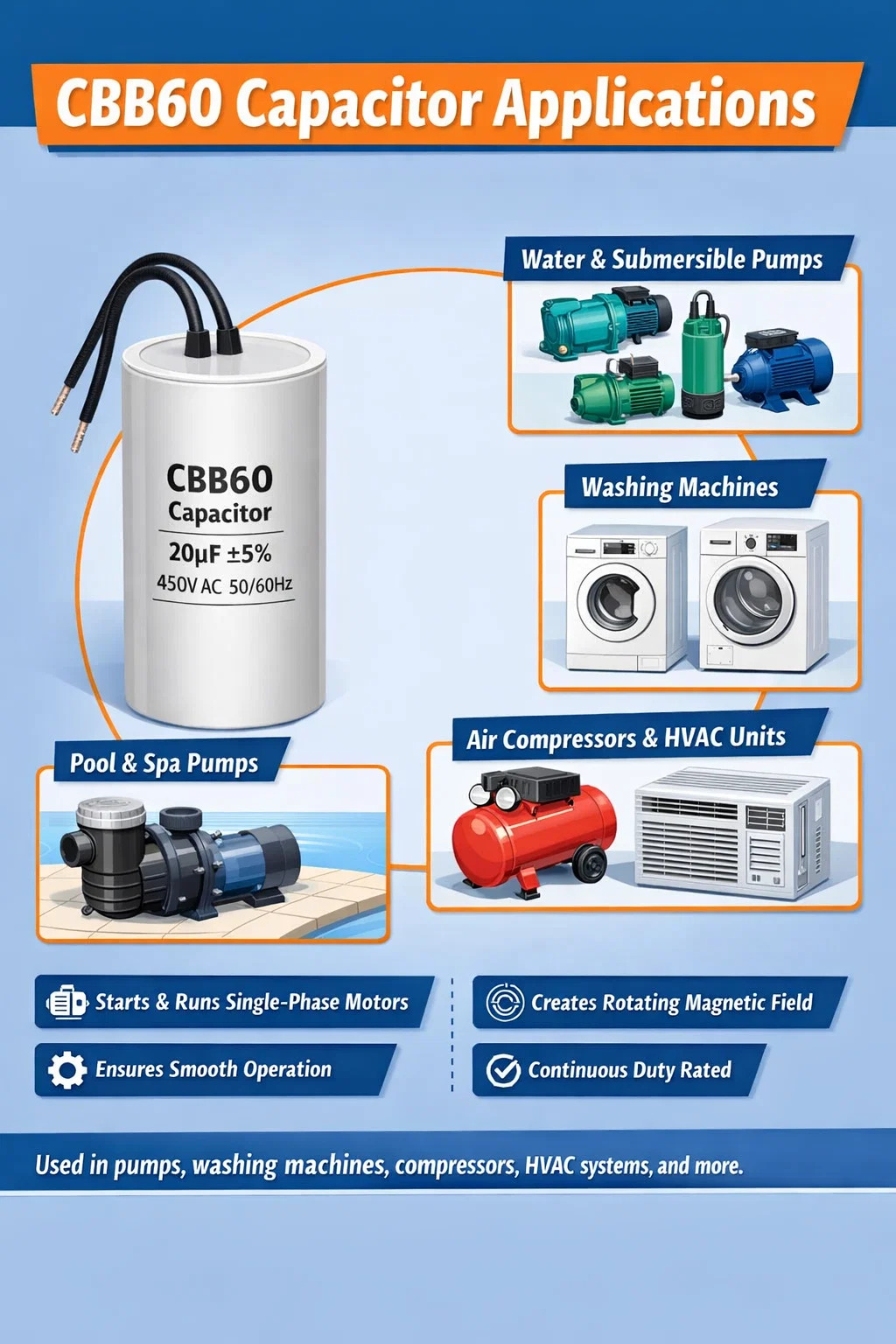 Конденсатор CBB60 встречается в удивительно широком спектре оборудования. Хотя на рынке доминируют насосы, способность компонента выдерживать постоянное переменное напряжение номинальной частоты делает его пригодным везде, где однофазному двигателю требуется помощь в создании второй фазы.